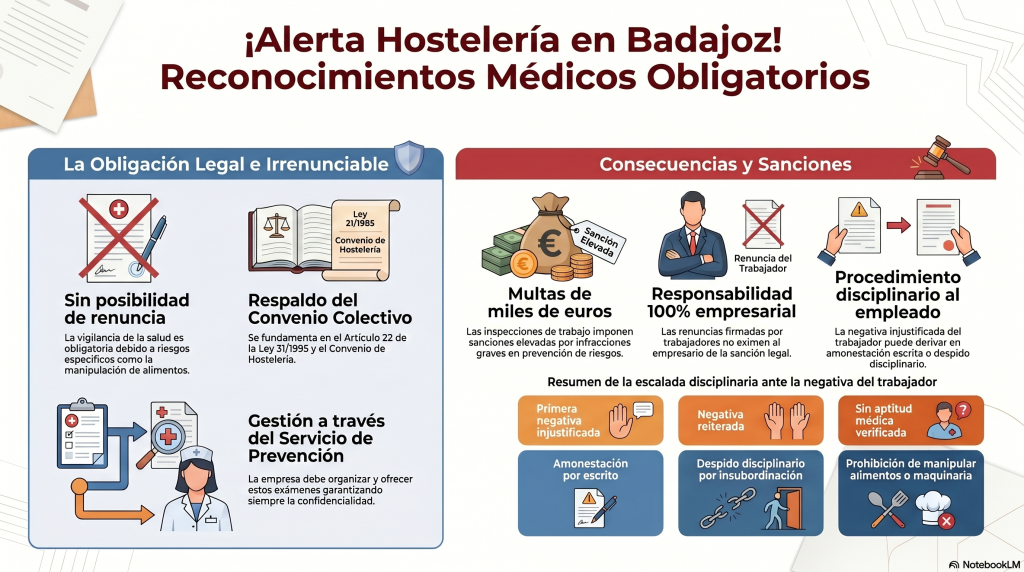 Según la Ley 31/1995 de Prevención de Riesgos Laborales (art. 22) y el Convenio de Hostelería de Badajoz (art. 35), la empresa debe organizar, ofrecer y acreditar estos exámenes anuales ante cualquier inspección.