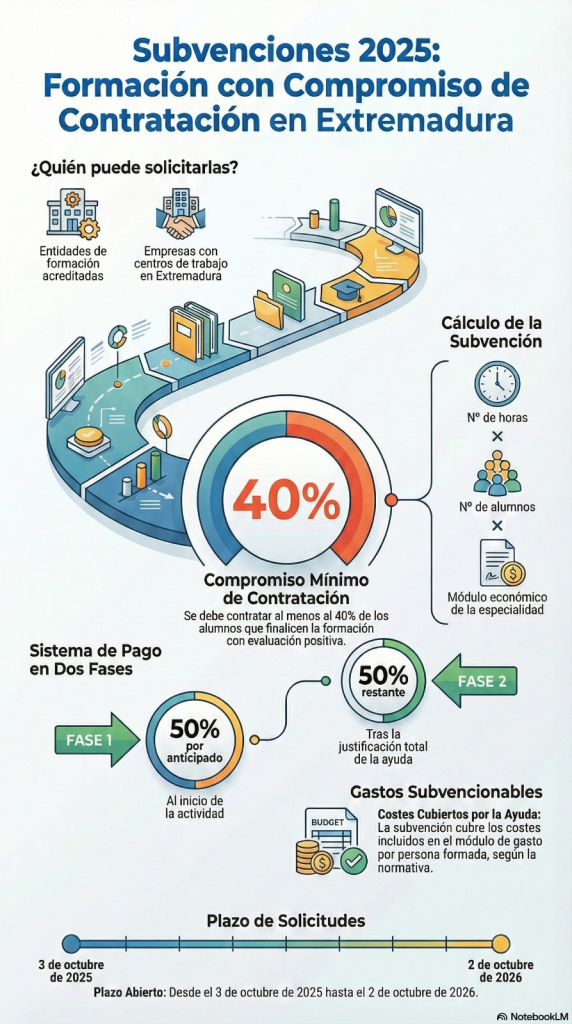 El Servicio Extremeño Público de Empleo (SEXPE) ha convocado en 2025 una ayuda destinada a financiar acciones formativas con compromiso de contratación, dirigida a personas trabajadoras desempleadas en la Comunidad Autónoma de Extremadura.