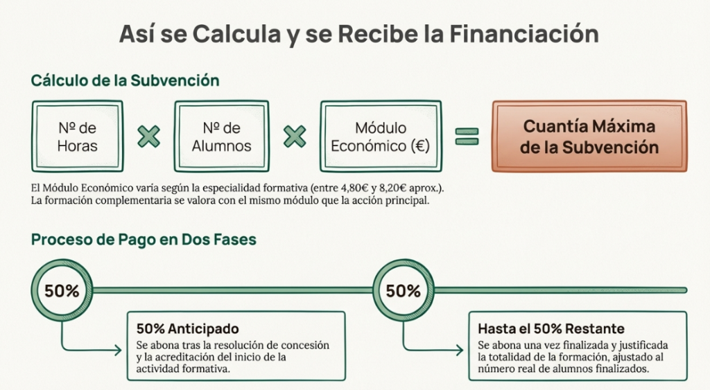 La subvención tiene carácter modular, lo que significa que no se justifica gasto a gasto, sino en función del número de personas que finalizan la formación y de las horas impartidas, aplicando el módulo económico correspondiente a cada especialidad.