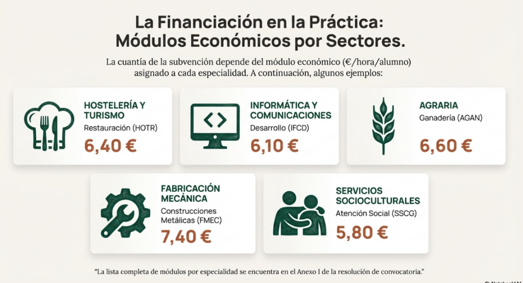 Los módulos varían según el área, con importes orientativos que oscilan entre 4,80 €/hora y 8,20 €/hora.