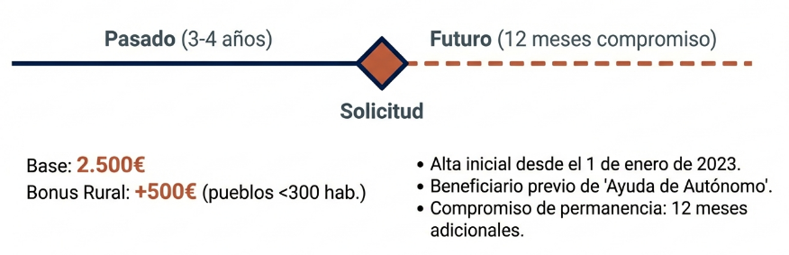 con compromiso de permanecer 12 meses adicionales. - Línea II «Impulso (4+1)»: 2.500€ + 500€ (pueblos <300 hab.)