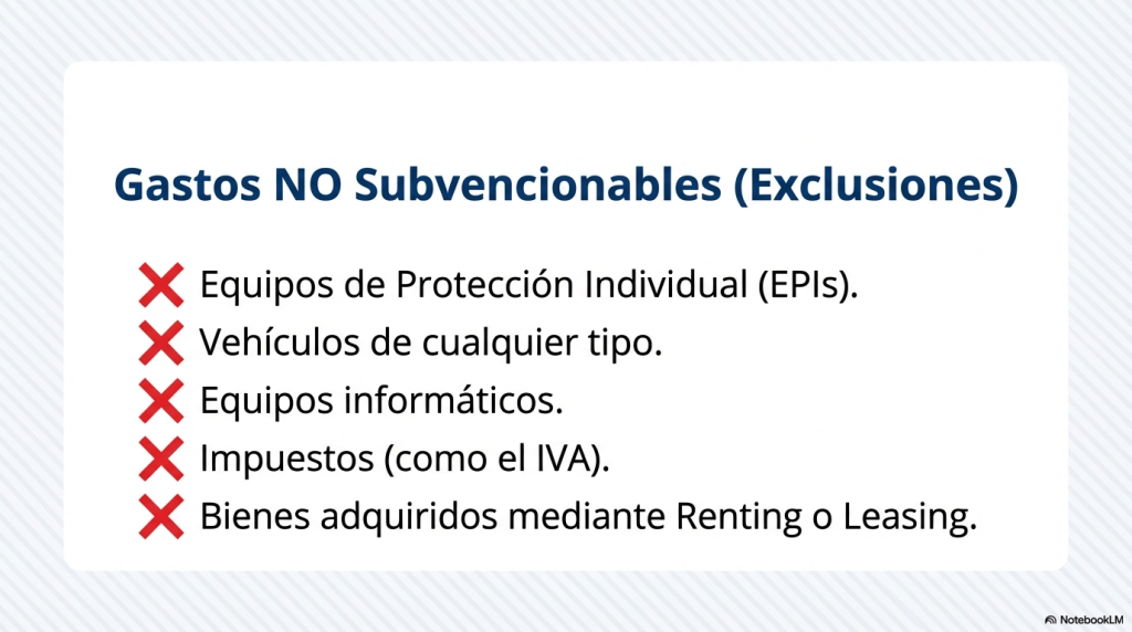 Gastos excluidos: No se subvencionan EPIs, vehículos, equipos informáticos, impuestos (IVA), ni bienes adquiridos mediante renting o leasing.